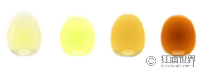 對于白葡萄酒來說,酒液中的單寧含量極少,因而在陳年時幾乎是一個純粹氧化的過程,顏色在這一過程中會逐漸變得深濃,由檸檬色或淺綠色轉為金黃色,繼而轉變為琥珀色。
