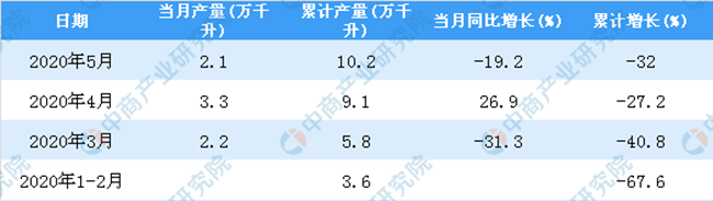 據中商產業研究院數據庫顯示,2020年5月全國葡萄酒產量下降,2020年5月全國葡萄酒產量為2.1萬千升,同比下降19.2%。2020年1-5月全國葡萄酒產量為10.2萬千升,同比下降32%。