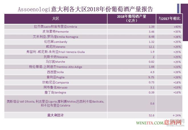 11月中旬,隨著意大利全境葡萄采摘季結(jié)束,意大利釀酒師及釀酒技術(shù)協(xié)會(huì)(Assoenologi)公布了關(guān)于2018年份意大利葡萄酒的產(chǎn)量報(bào)告?;谝獯罄r(nóng)業(yè)部的官方數(shù)據(jù),該報(bào)告做出結(jié)論:2018年,意大利葡萄酒及葡萄汁產(chǎn)量將比2017年份增長24%,將達(dá)到52.6億升。今年意大利葡萄酒產(chǎn)量的實(shí)際增幅超越了8月末曾發(fā)布的產(chǎn)量預(yù)告,整體形勢(shì)較為樂觀。