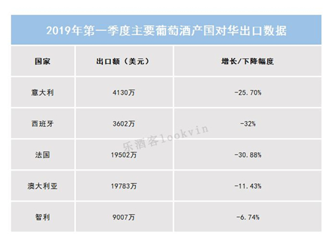 根據(jù)報(bào)告,2019年第一季度中國(guó)進(jìn)口葡萄酒進(jìn)口量為1.56億升,較上年同期下降22.3%;進(jìn)口額為7.82億美元,較上年同期(9.8億美元)下降20.19%。