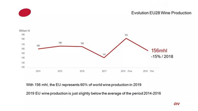 歐盟國家2019年葡萄酒產(chǎn)量156億升(mhl),占據(jù)全球葡萄酒產(chǎn)量的60%,略低于2014-2016年平均水平。